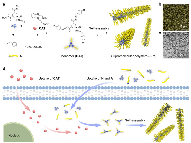 Recently, Prof. Guo Xuhong and Specially Appointed Researcher Yi-Ming Wang from the School of Chemical Engineering, ECUST achieved a groundbreaking advance in the controlled synthesis of abiotic supramolecular polymers within living cells. Their research article titled “Synthesis of Abiotic Supramolecular Polymers Inside Living Cells via Organocatalysis-Mediated Self-Assembly”, was published in Angewandte Chemie International Edition (Angew. Chem. Int. Ed.) and recognized as a Hot Paper.